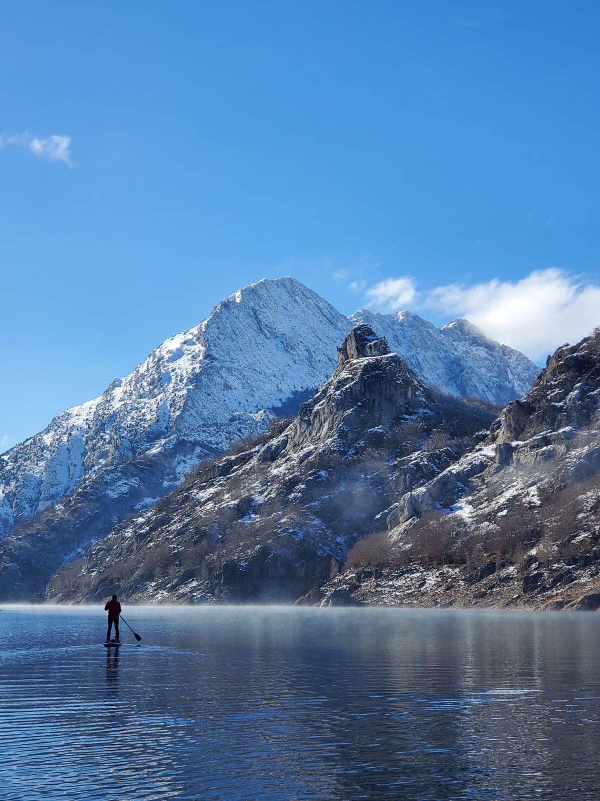 This reservoir provides us with different route options depending on the wind conditions we have, so with its 100km of coastline we consider the best option. From the water we enjoyed the silence, the magic of having impressive peaks above us with snow, even waterfalls that in those temperatures have turned into snow stalactites. 2 hours paddling, connecting with ourselves, with the nature that surrounds us.