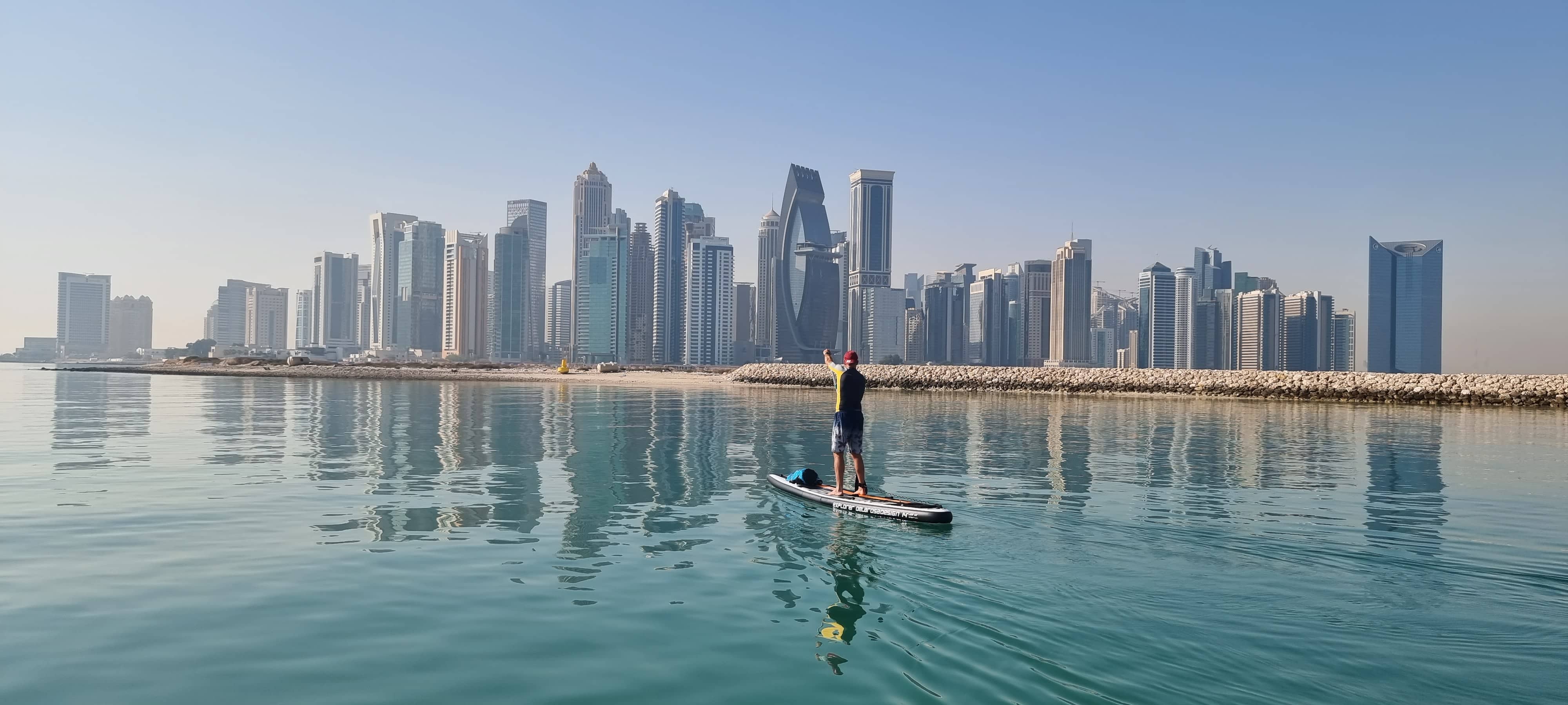 Al finde siguiente ocurrió lo mismo, el sábado el viento decidió dar una tregua y ahí es cuando me enamore de Doha. Llame a mi amigo Alex y le dejé mi otra Explorer para llevarlo por fin en una verdadera aventura de las que tanto le hable pero nunca pude hacer con el ya que no tenia suficiente experiencia en mar picado. Fue increíble, maravilloso y aun sigo teniendo en mi mente esa sensación de liberta combinada con belleza pura e naturaleza. Otra vez era un día tranquilo sin tráfico marítimo por la mañana. Nos pararon unos guardas costas que no nos dejaron descansar en la playa porque todo era privado así que nos sentábamos en la tabla para despertar los pies entumecidos, solo decíamos “woaaaww” apenas hablábamos porque otra vez la madre naturaleza nos mostró su gran esplendor, peces flautas saltando alrededor de nosotros, rayas y tremolosas, un par de tortugas y unos peces voladores que se pegaban unos esprint impresionante. De fondo toda la ciudad pero al otro se abría el horizonte azul sin límite. Nos retamos a remar y remar, Alex lo estaba haciendo muy bien era su primera vez en condiciones buenas. Salir a remar larga distancia en condiciones difíciles para alguien novato se convertir en un factor negativo y llevar al abandono de este deporte tan maravilloso’Eso puede ser un factor negativo.
